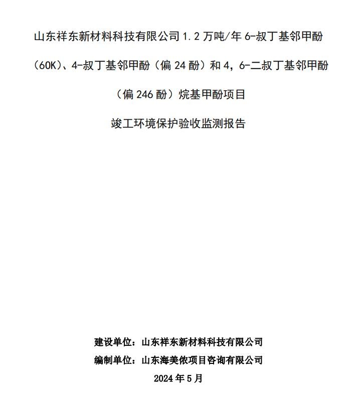 項目名稱:山東祥東新材料科技有限公司1.2萬噸/年6-叔丁基鄰甲酚(6OK)、4-叔丁基鄰甲酚(偏24酚)和4,6-二叔丁基鄰甲酚(偏246酚)烷基甲酚項目
